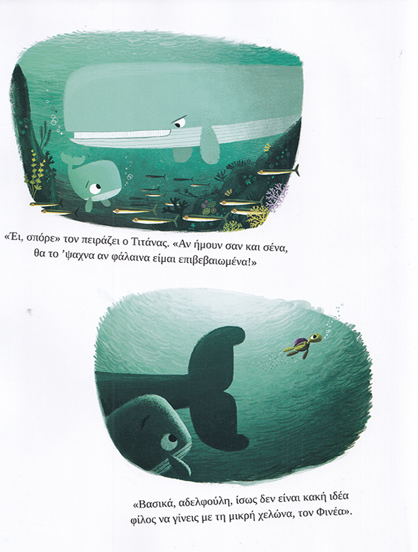 Ένας ουρανός μαβής φορτωμένος αστραπές και βροντές. Μια θάλασσα φουρτουνιασμένη με κύματα σαν βουνών κορυφές. Με τον Ατλαντικό βρέθηκε το καράβι ενάντιο, εκεί που κατοικεί ένα φαλαινάκι που το λένε… Γιγάντιο. Αυτό το τυπάκι είναι ασυνήθιστο, διαφορετικό, η μικρότερη γαλάζια φάλαινα που θα βρεις στο νερό. Η μικρή φάλαινα με τη μεγάλη καρδιά.