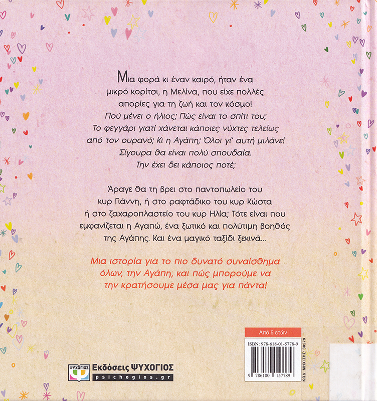 Μια φορά κι έναν καιρό, ήταν ένα μικρό κορίτσι, η Μελίνα, που είχε πολλές απορίες για τη ζωή και τον κόσμο! Πού μένει ο ήλιος; Πώς είναι το σπίτι του; Το φεγγάρι γιατί χάνεται κάποιες νύχτες τελείως από τον ουρανό; Κι η Αγάπη; Όλοι γι’ αυτή μιλάνε! Σίγουρα θα είναι πολύ σπουδαία. Την έχει δει κάποιος ποτέ;