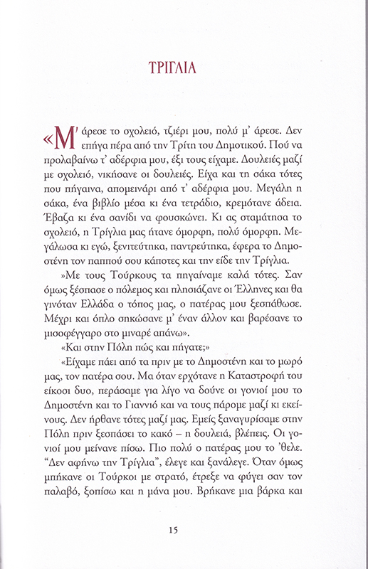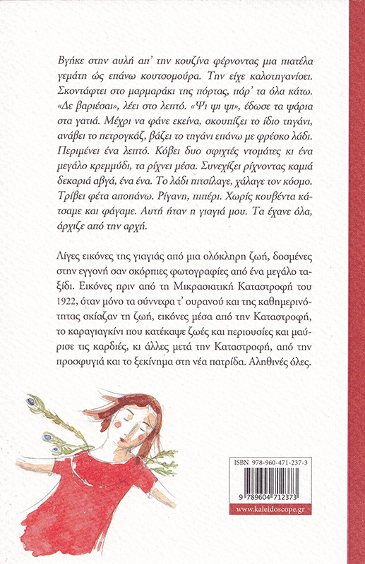 Βγαίνει στην αυλή φέρνοντας μια πιατέλα γεμάτη ως επάνω κουτσομούρα. Σκοντάφτει στο μαρμαράκι της πόρτας, πάρ’ τα όλα κάτω. «Δε βαριέσαι», λέει στο λεπτό. «Ψι ψι ψι», έδωσε τα ψάρια στα γατιά. Μέχρι να φάνε εκείνα, σκουπίζει το ίδιο τηγάνι, ανάβει το πετρογκάζ, βάζει το τηγάνι επάνω με φρέσκο λάδι. Αυτή ήταν η γιαγιά μου. Τα έχανε όλα, άρχιζε από την αρχή.