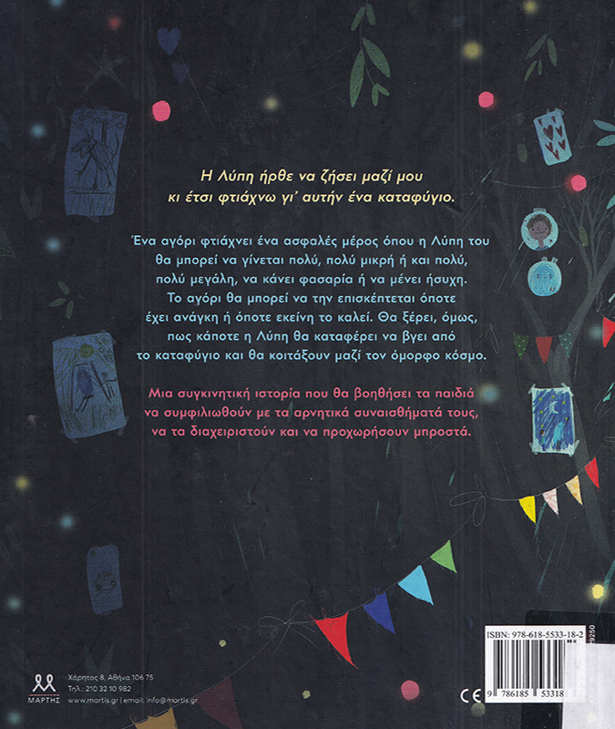 Ένα αγόρι φτιάχνει ένα ασφαλές μέρος όπου η Λύπη του θα μπορεί να γίνεται πολύ, πολύ μικρή ή και πολύ, πολύ μεγάλη, να κάνει φασαρία ή να μείνει ήσυχη. Το αγόρι θα μπορεί να την επισκέπτεται όποτε έχει ανάγκη ή όποτε εκείνη το καλεί. Θα ξέρει, όμως, πως κάποτε η Λύπη θα καταφέρει να βγει από το καταφύγιο και θα κοιτάξουν μαζί τον όμορφο κόσμο.